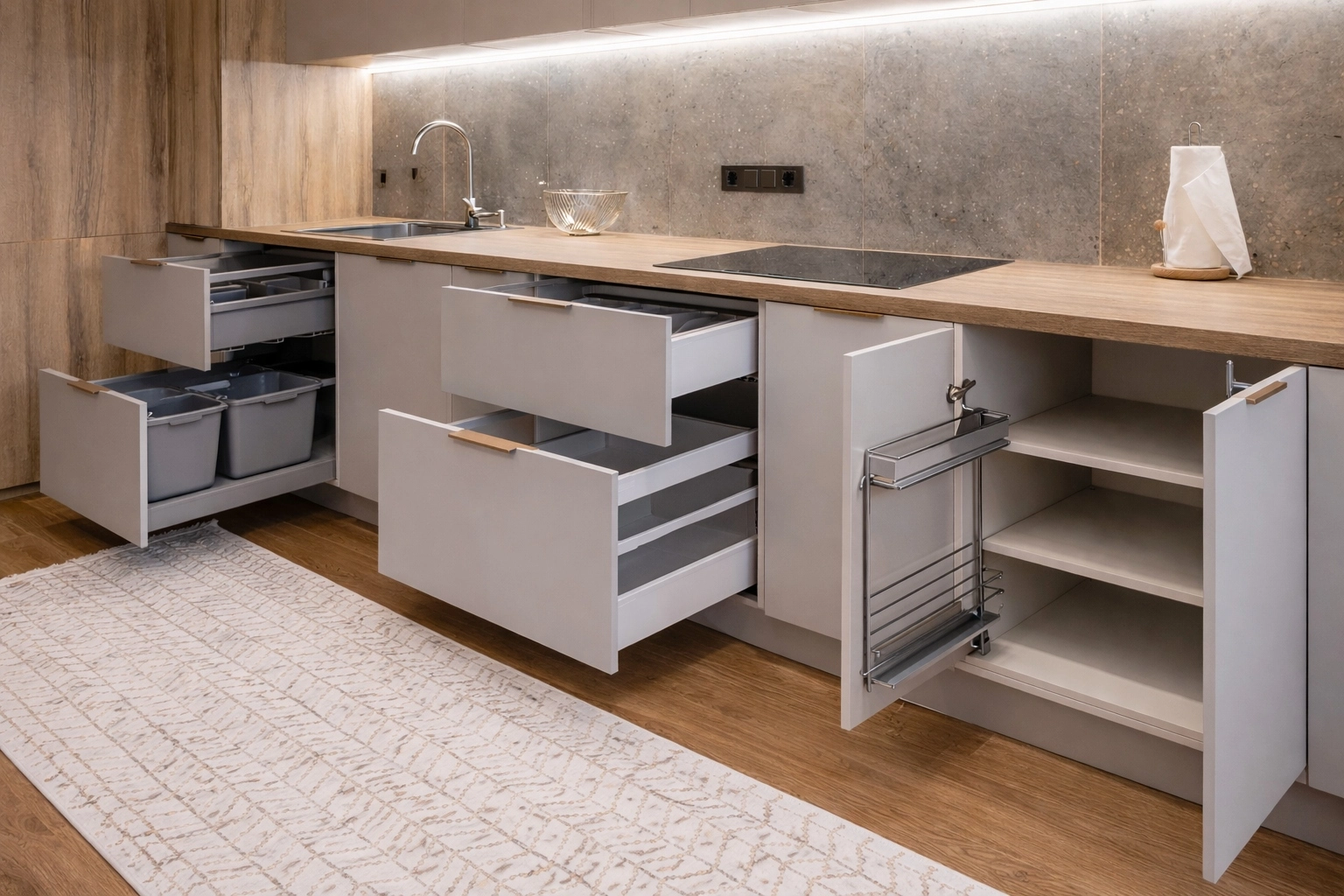 Los muebles bajos son la base de la cocina y soportan la encimera. En ellos se concentra gran parte del almacenamiento y suelen albergar cajones, cuberteros y módulos para ollas y sartenes.